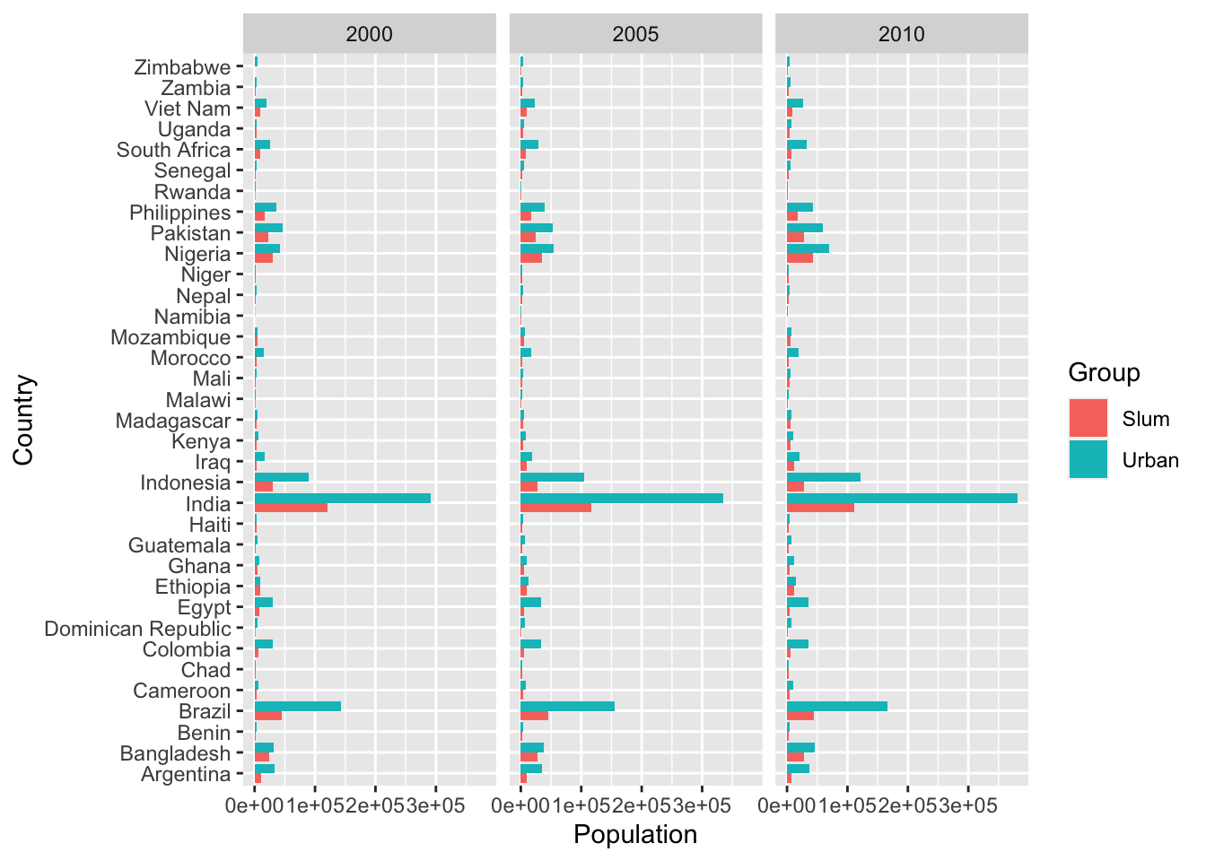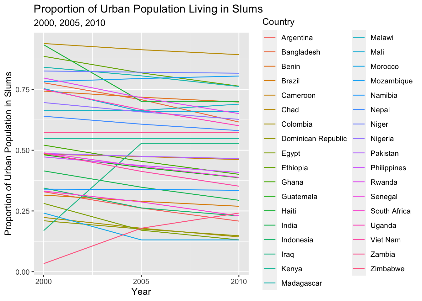 labs(x = "Year", y = "Proportion of Urban Population in Slums", title = "Proportion of Urban Population Living in Slums", subtitle = "2000, 2005, 2010")