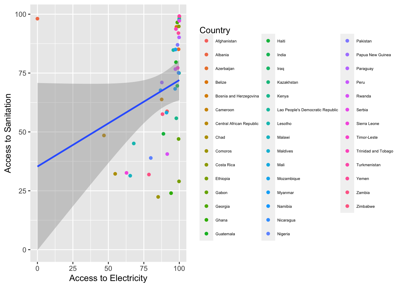 theme(legend.text = element_text(size=5), legend.spacing.y = unit(.001, 'cm'), legend.spacing.x = unit(.1, 'cm')) + labs(y="Access to Sanitation", x="Access to Electricity") +