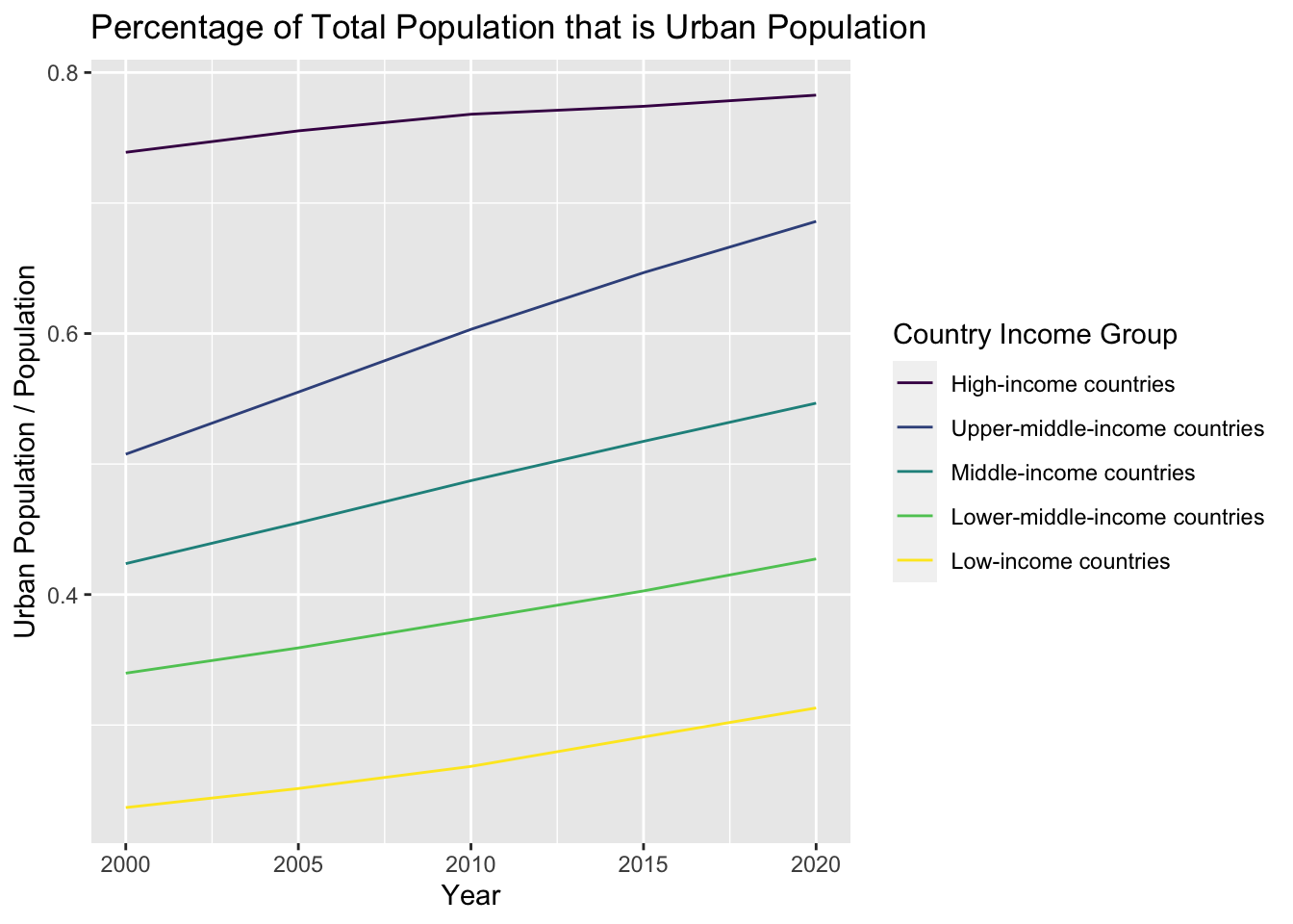 labs(title = "Percentage of Total Population that is Urban Population", x = "Year", y = "Urban Population / Population", color = "Country Income Group")
